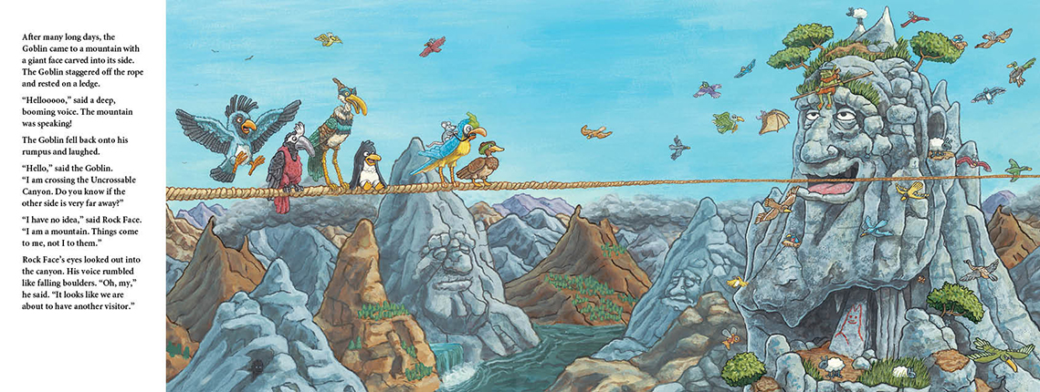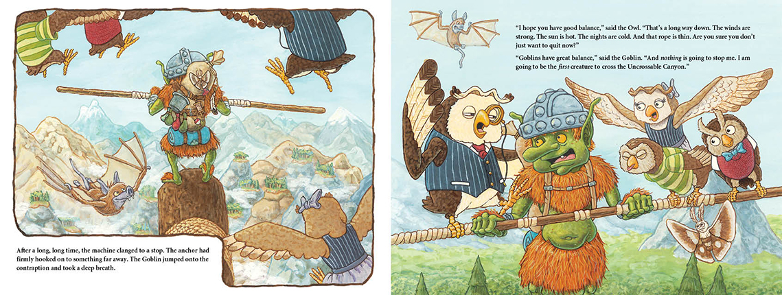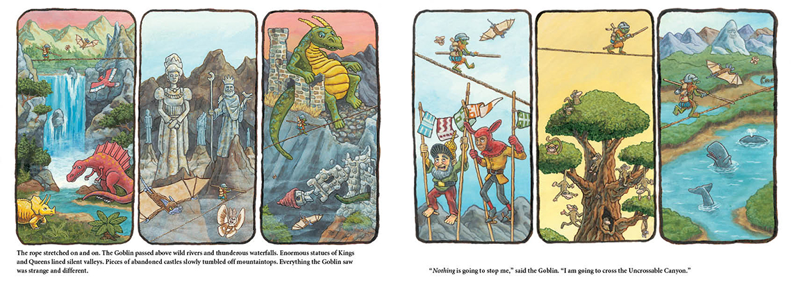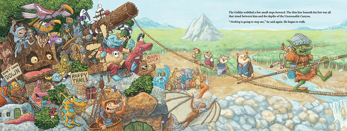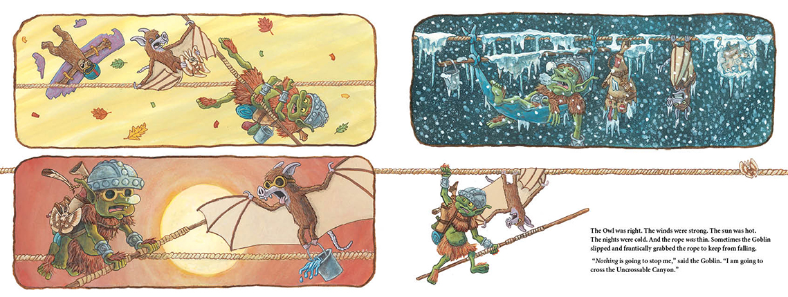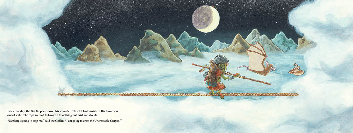 The sun may be hot. The winds may be strong. The nights may be cold. The rope may be thin. And the drop might as well last forever. But the Goblin swears he is going to be the first creature to cross the Uncrossable Canyon. Nothing is going to stop him.
