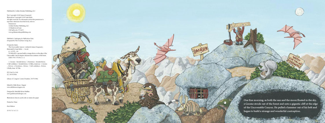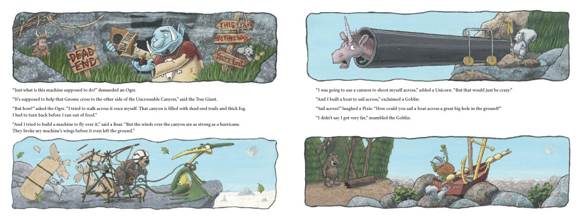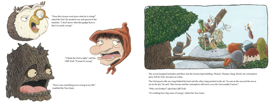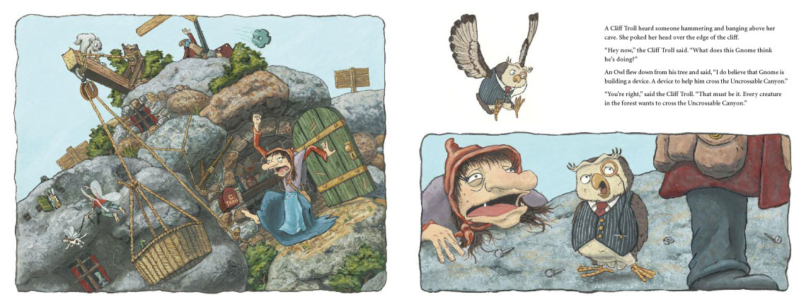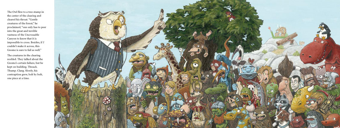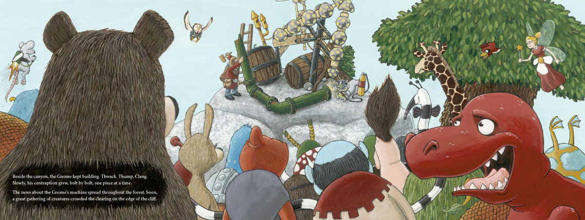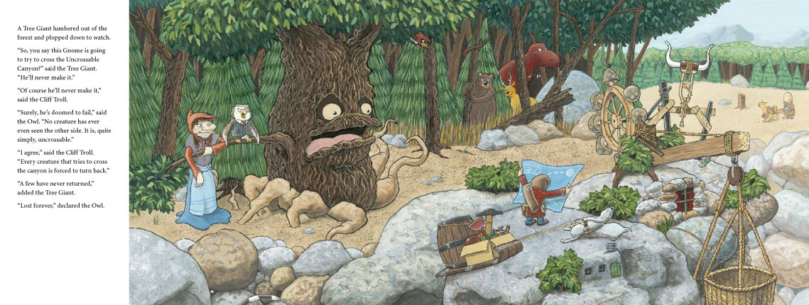One day a Gnome strides out of the forest and begins to build a strange contraption right on the edge of the canyon. A great gathering of creatures walks, flies, crawls, and slithers out of the forest to watch. They all predict failure and doom for the Gnome’s machine.